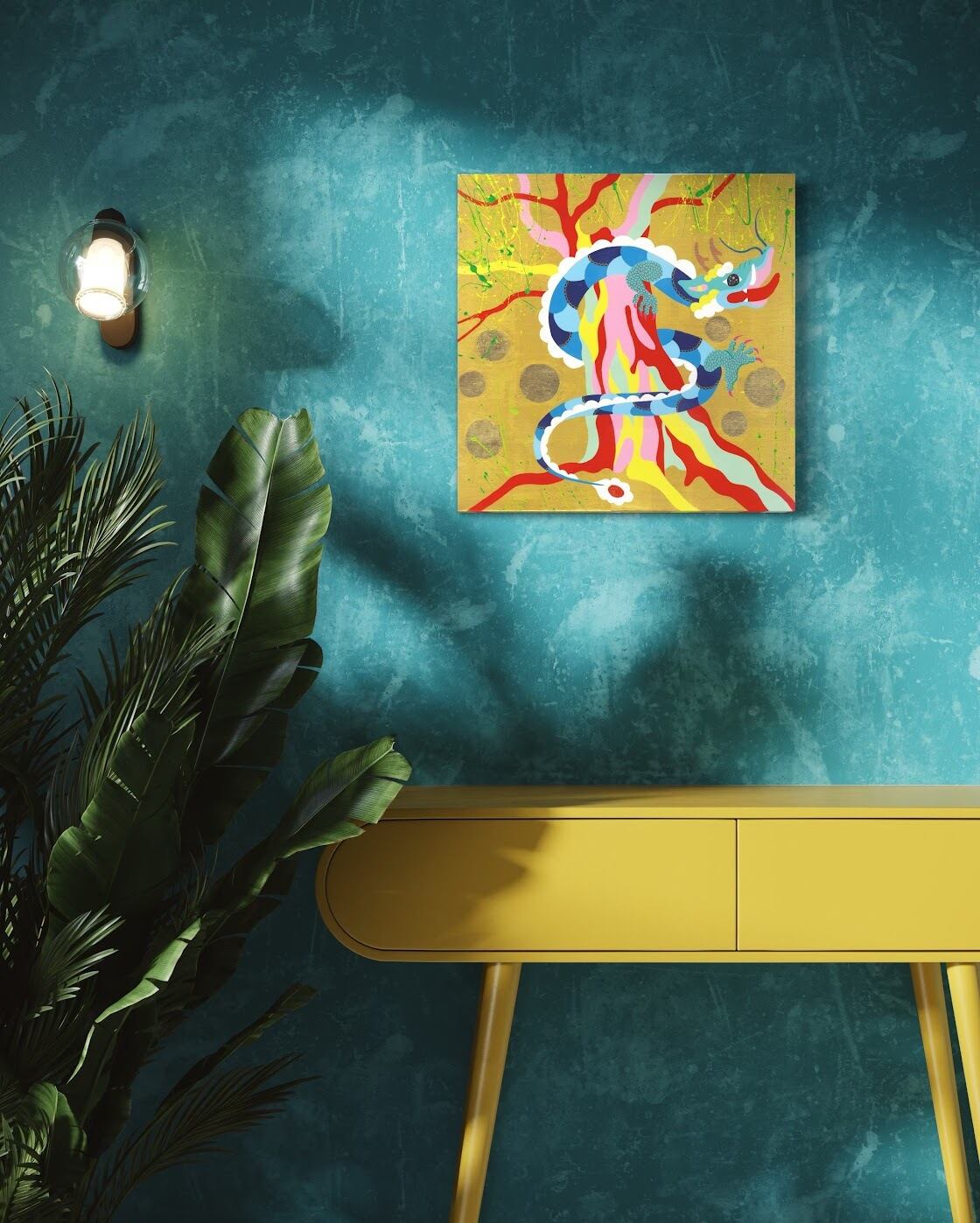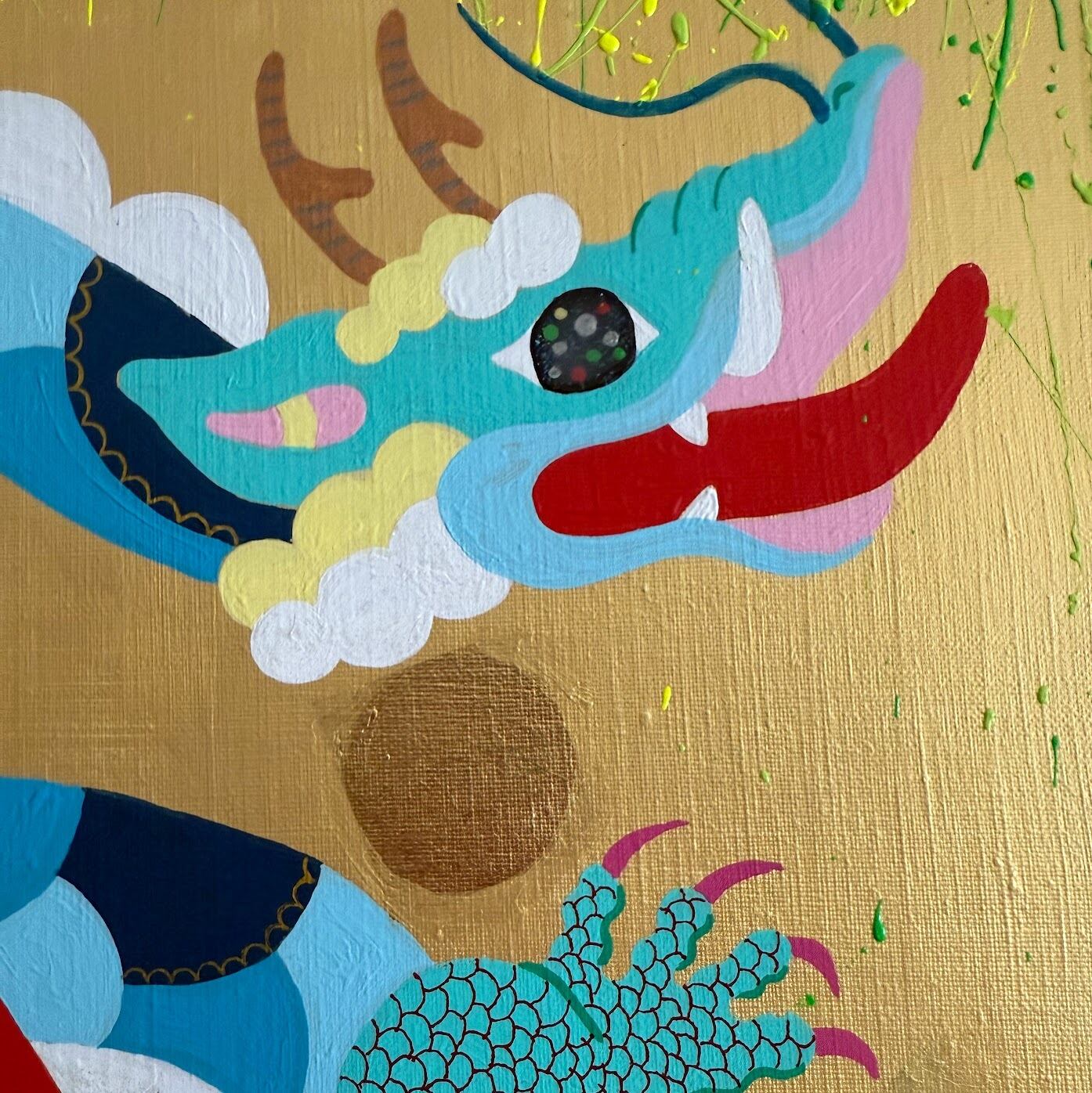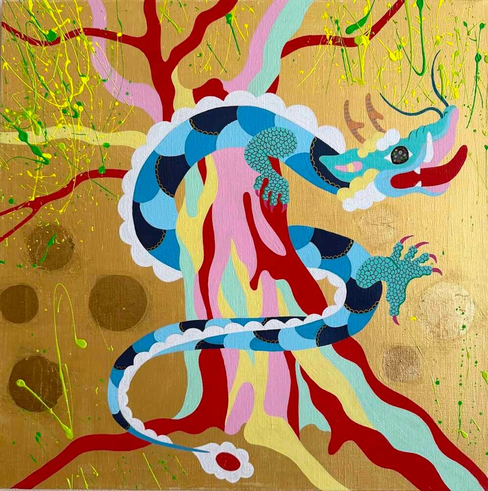 背景はアクリルで描き、水玉部分には金箔を施しており、龍と樹の生命力を一層引き立てています。